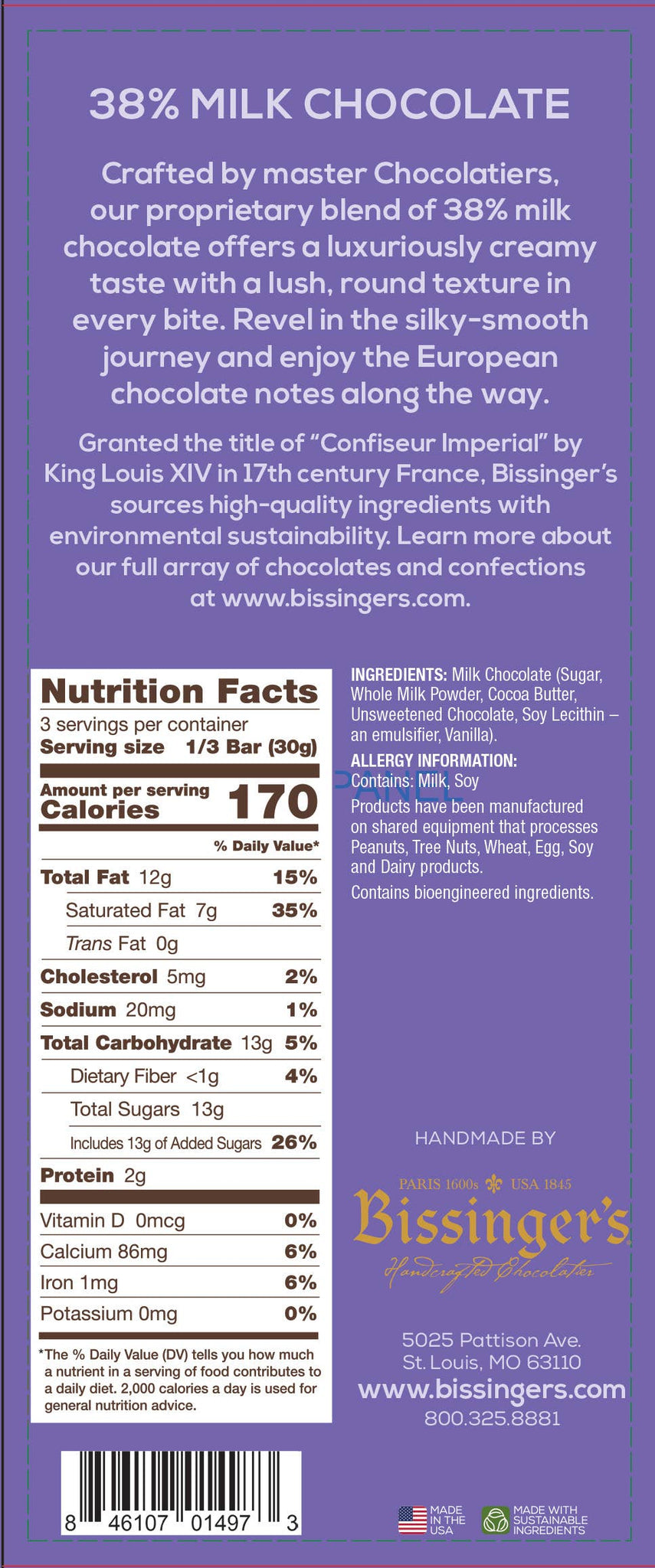 A milk chocolate lover's dream. Crafted by master Chocolatiers, our proprietary milk chocolate offers a full chocolate flavor because unlike other European milk chocolate recipes that use 30% cacao, ours boasts a 38% level. It's a luxuriously creamy taste with soft caramel nuances for a lush, round tasting experience. 3 OZ