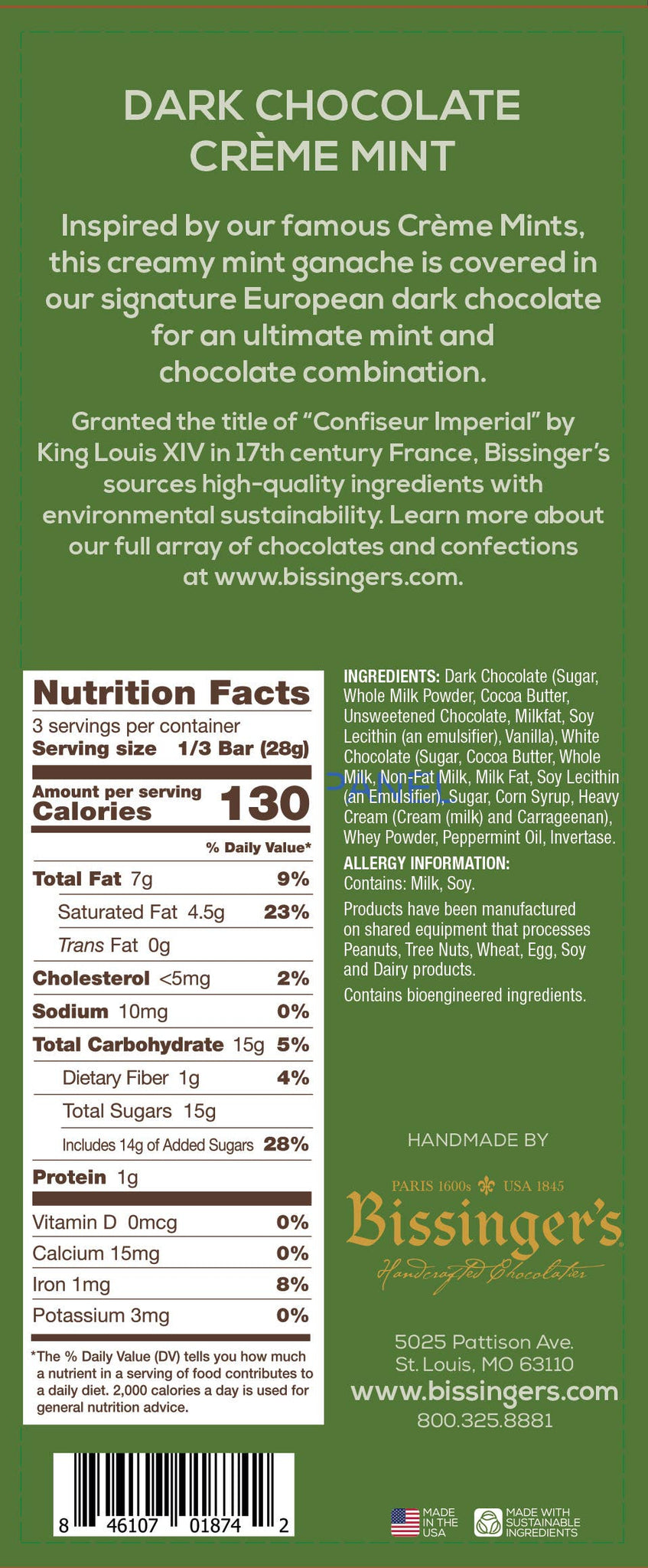 Handcrafted to perfection. First, we use the natural oil of peppermint and infuse it into a white chocolate ganache and pair it with Bissinger's 60% European Dark Chocolate. This NEW bar was crafted to taste just like our famous Crème mint confections, a customer favorite for over 80 years! 3 OZ Bar