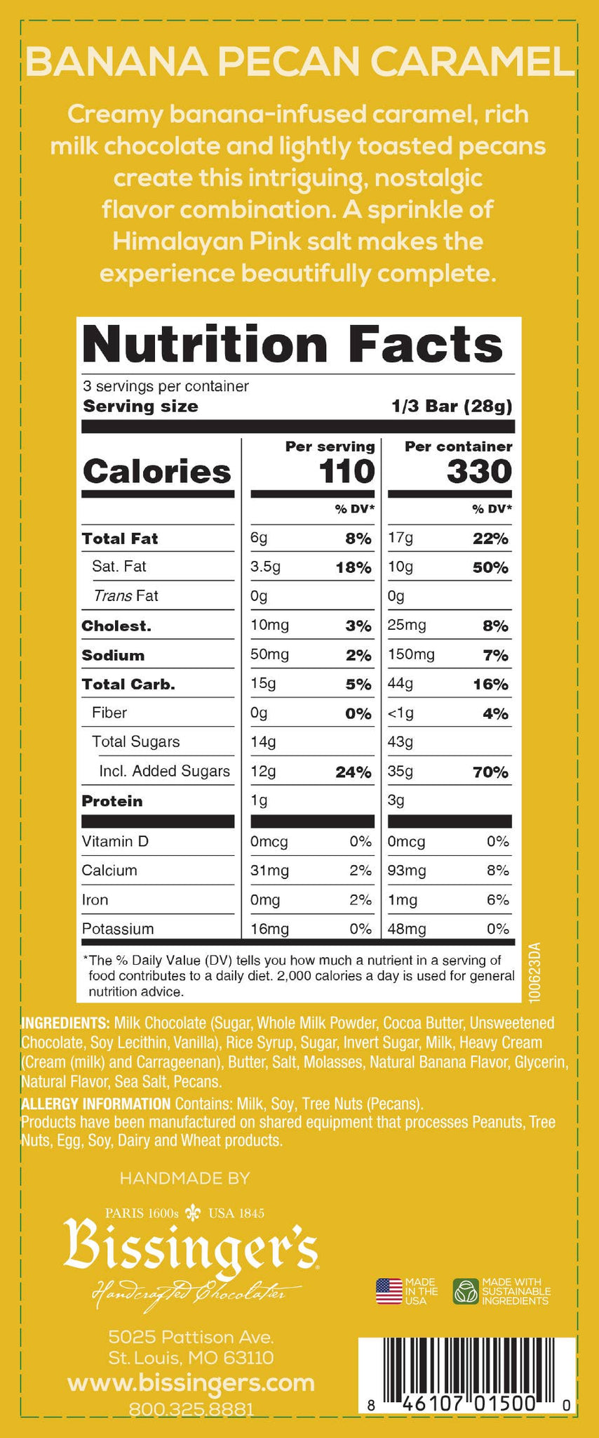 Our banana-infused caramel mixes with toasted crumbles of pecans and is drenched in our 38% milk chocolate. It is finished with a light Pink Peruvian artisan salt to delightfully roll across your taste buds. 3 OZ Bar