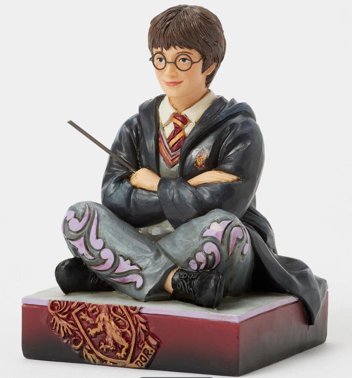 This striking Jim Shore effigy showcases Harry Potter seated on the floor in his school robes, with his wand ready in hand. His determined expression captures his heroic spirit, while the intricate folk art details bring his character to life.