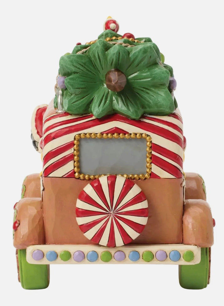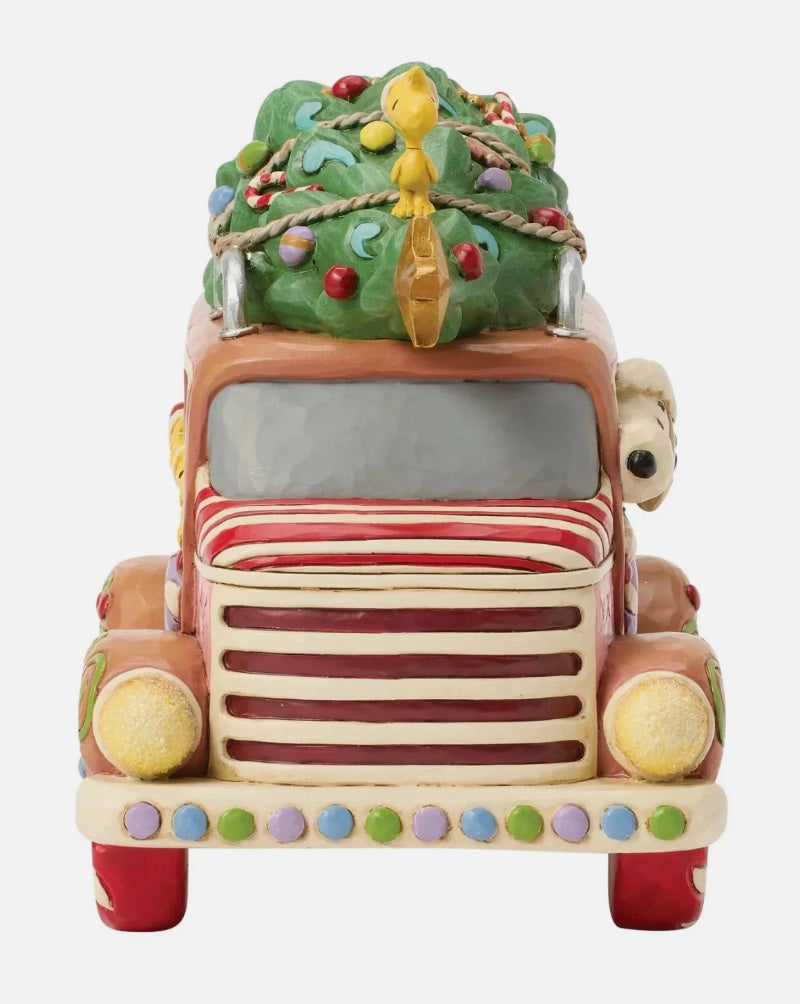 Brighten your holiday season with this playful Jim Shore design of Snoopy driving a festive gingerbread cookie van. Snoopy steers with joy as peppermint wheels spin, while Woodstock rides on the roof with a decorated Christmas tree in tow.